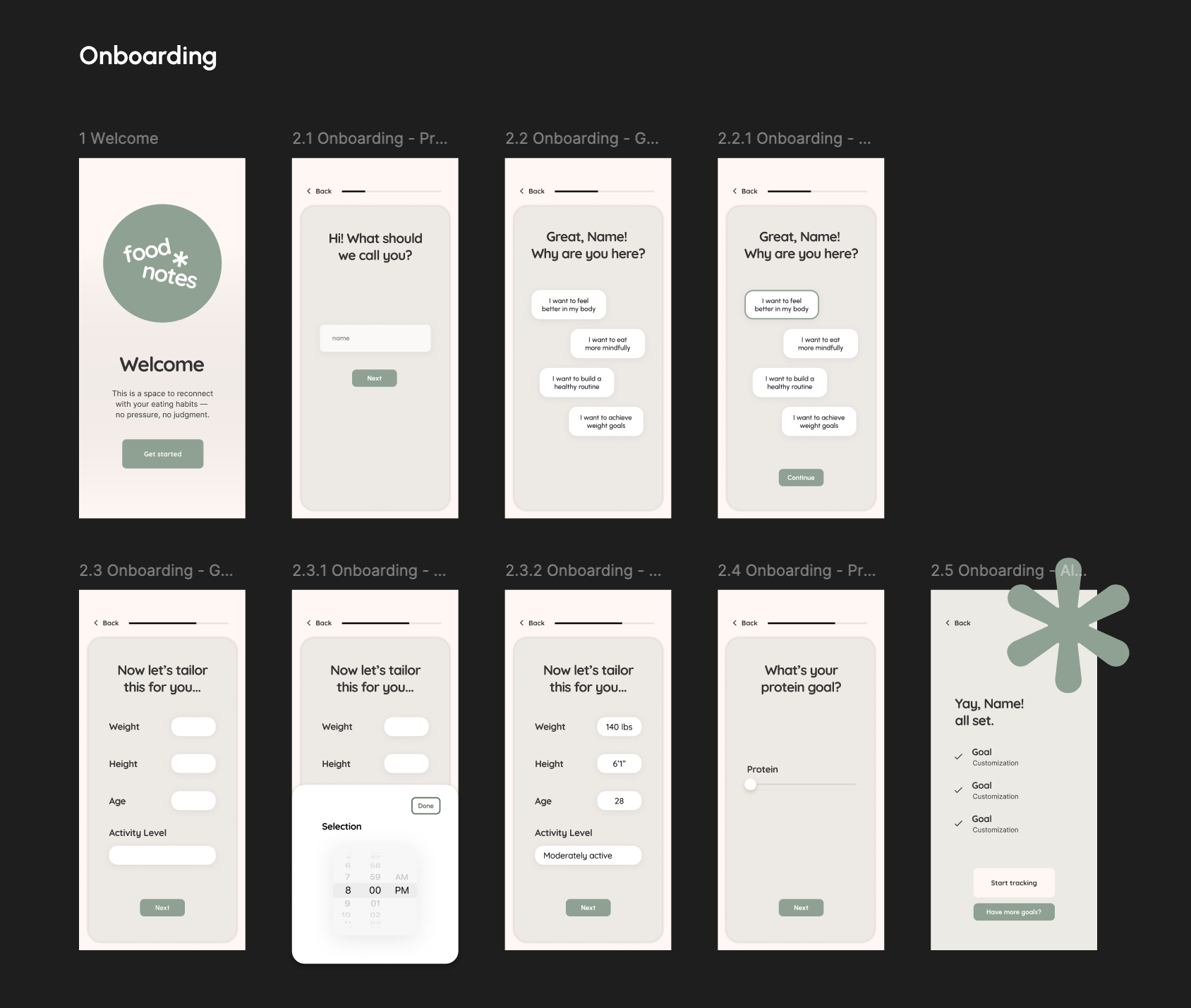 User research highlighted a critical gap: the absence of a gentle onboarding compromised the desired emotional experience. This led to wireframing early concepts focused on a soft, empathetic onboarding flow.